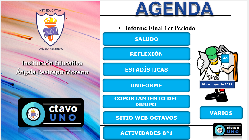 El siguiente archivo contiene La AGENDA con la información del informe final del primer periodo del Grupo 8°1 2025 de la I.E. Ángela Restrepo Moreno.